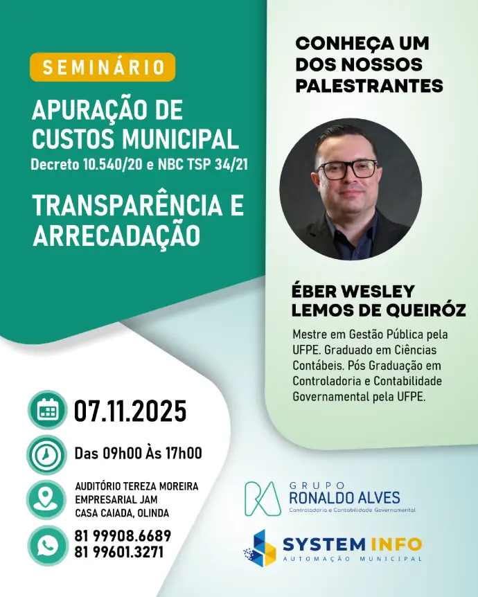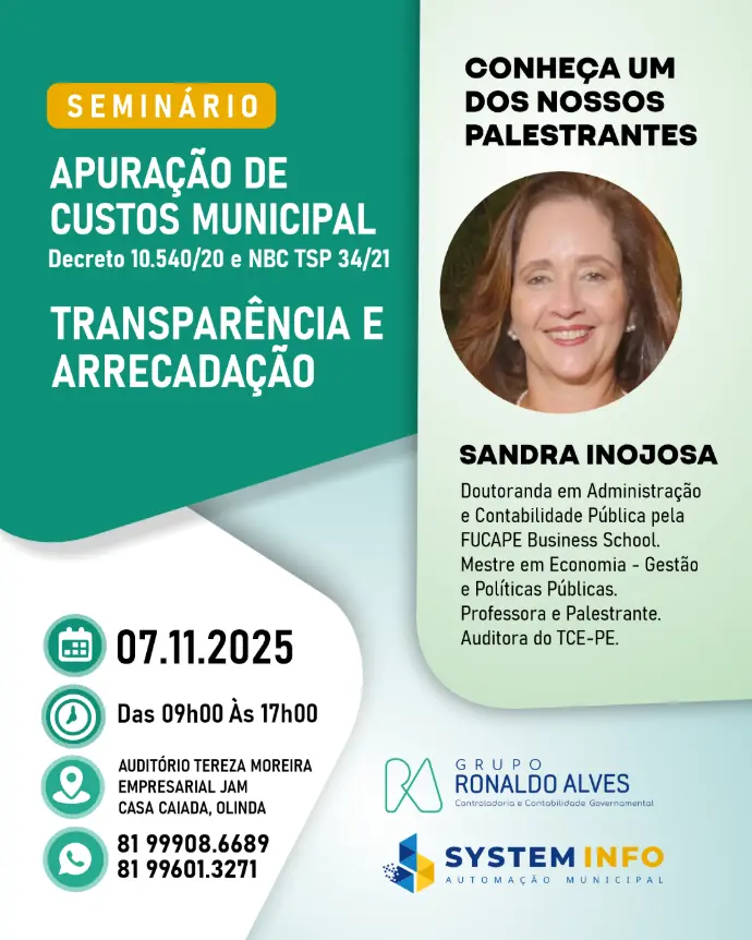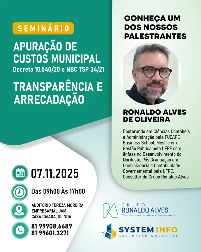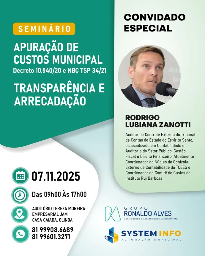 Você é nosso(a) convidado(a) para o Seminário Municipal sobre Apuração de Custos, Transparência e Arrecadação. Um encontro prático para alinhar critérios legais, boas práticas e ferramentas que fortalecem a governança municipal.